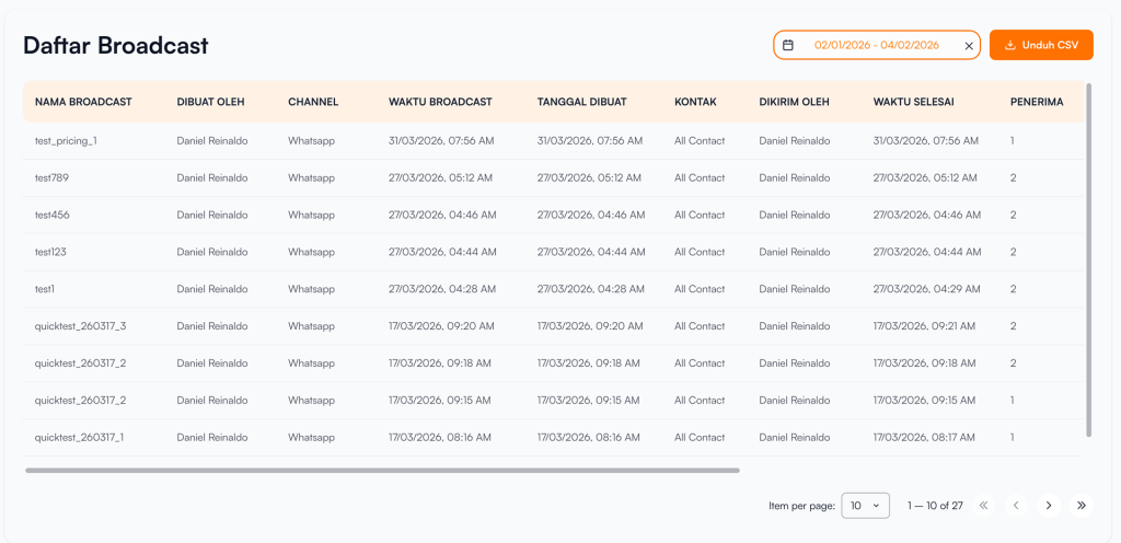 Daftar Broadcast pada Layanika adalah fitur laporan yang berisi seluruh aktivitas pengiriman broadcast yang telah dibuat, sedang berjalan, maupun yang sudah pada periode tertentu. Fitur ini membantu penguna memantau dan manajemen semua broadcast.
