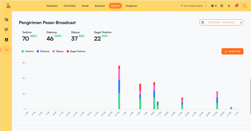 Laporan Broadcast pada Layanika adalah fitur laporan yang menyediakan data dan analisis terkait aktivitas pengiriman pesan broadcast kepada pelanggan pada periode tertentu. Fitur ini membantu bisnis dalam memantau performa kampanye serta mengevaluasi efektivitas komunikasi yang dilakukan.