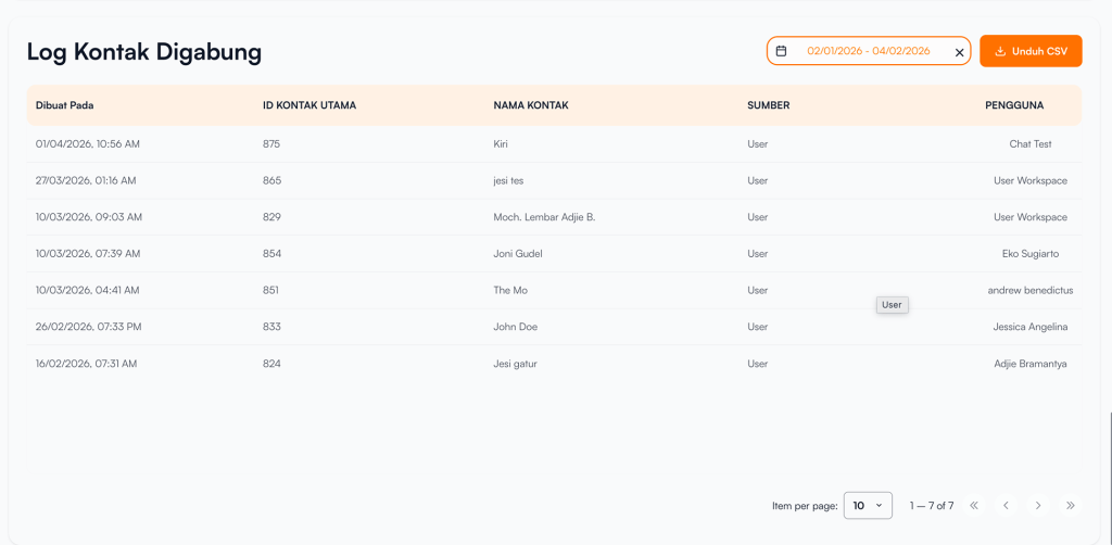| Pengguna | Nama pengguna (agen) yang melakukan penggabungan kontak |