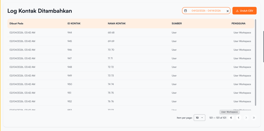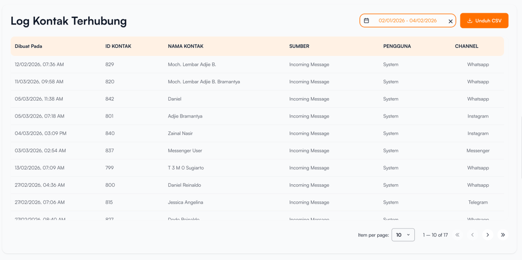 Log Kontak Ditambahkan adalah bagian dari laporan kontak yang menampilkan riwayat penambahan kontak baru ke dalam sistem dalam periode tertentu, termasuk informasi waktu penambahan, sumber kontak, serta pengguna yang menambahkan kontak tersebut.