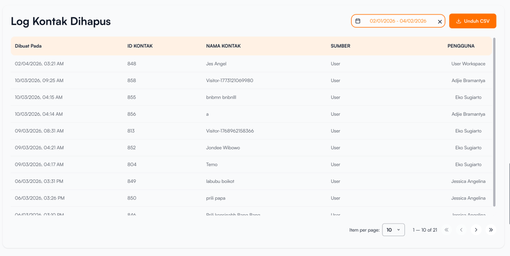 | Pengguna | Nama pengguna (agen) yang melakukan penghapusan kontak |