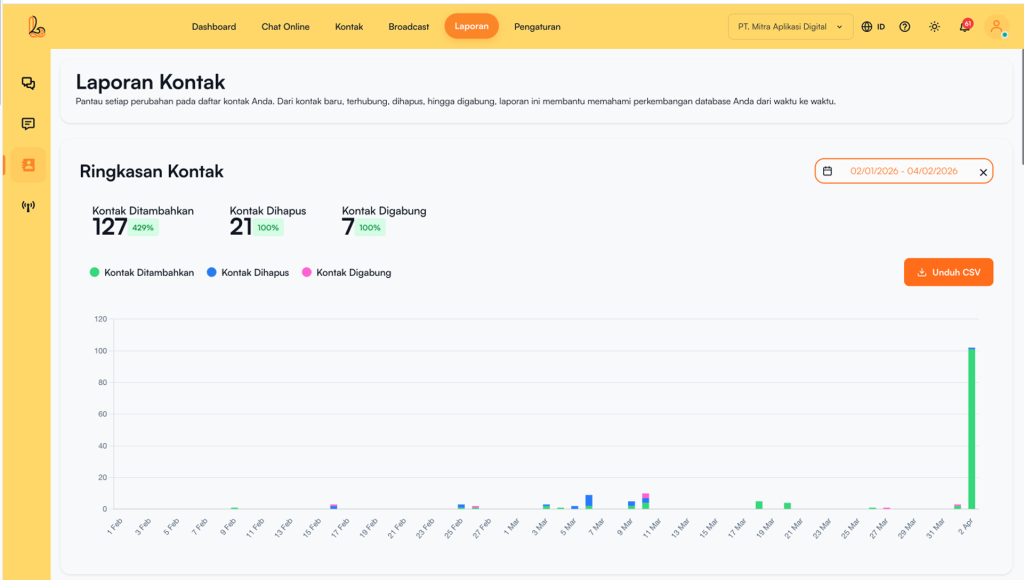 Ringkasan Kontak menampilkan gambaran umum terkait perubahan data kontak dalam periode waktu yang dipilih. Fitur ini membantu pengguna memahami pertumbuhan dan aktivitas kontak secara cepat.