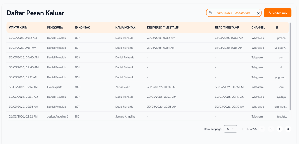 Daftar Pesan Keluar pada Layanika adalah fitur laporan yang menampilkan seluruh pesan yang dikirim oleh sistem atau agent kepada pelanggan melalui berbagai saluran aplikasi media sosial dalam periode tertentu. Fitur ini membantu memantau aktivitas pengiriman pesan secara terpusat dan terstruktur.