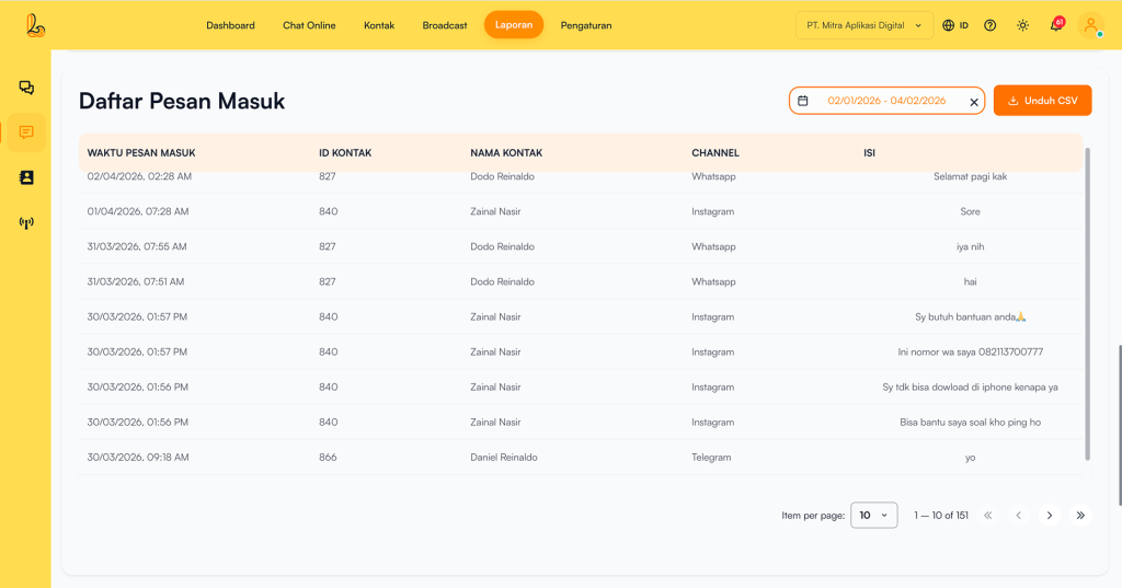 Daftar Pesan Masuk pada Layanika adalah fitur laporan yang menampilkan seluruh pesan yang diterima dari pelanggan melalui berbagai saluran aplikasi media sosial dalam satu inbox terpusat. Fitur ini memudahkan tim dalam memonitor, mengelola, dan merespons setiap pesan secara efisien.