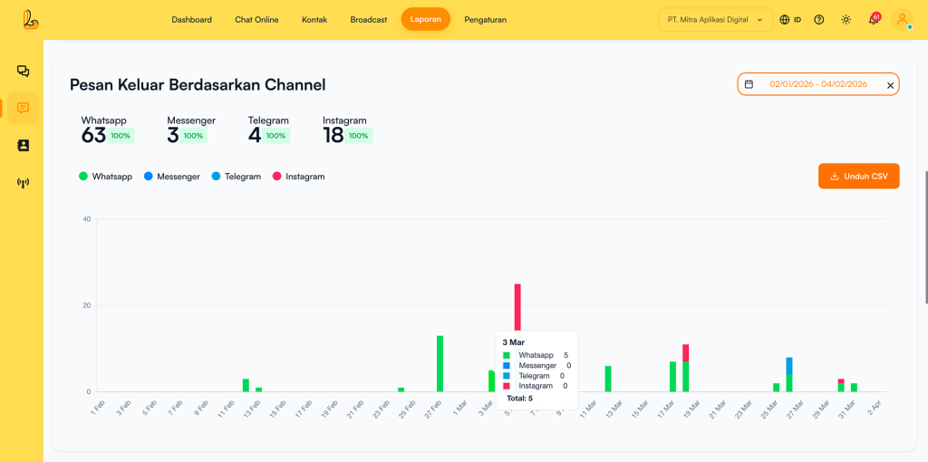 Pesan Keluar Berdasarkan Channel pada Layanika adalah fitur laporan yang menampilkan jumlah dan aktivitas pesan outbound (pesan yang dikirim) yang dikelompokkan berdasarkan masing-masing saluran aplikasi media sosial pada periode tertentu.