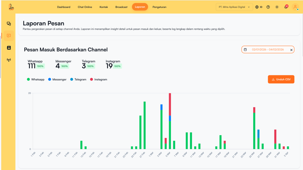 Pesan Masuk Berdasarkan Channel pada Layanika adalah fitur laporan yang menampilkan jumlah dan aktivitas pesan inbound (pesan yang diterima) yang dikelompokkan berdasarkan masing-masing saluran aplikasi media sosial komunikasi pada periode tertentu.