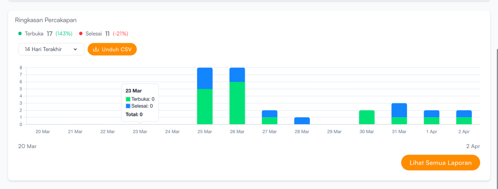 Ringkasan Percakapan digunakan untuk melihat performa aktivitas chat dalam periode tertentu.