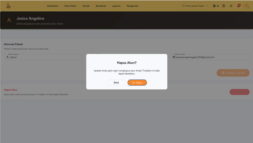 Klik tombol Hapus Akun. Sistem akan menampilkan konfirmasi hapus akun. Klik Ya, Hapus untuk melanjutkan proses menghapus akun.