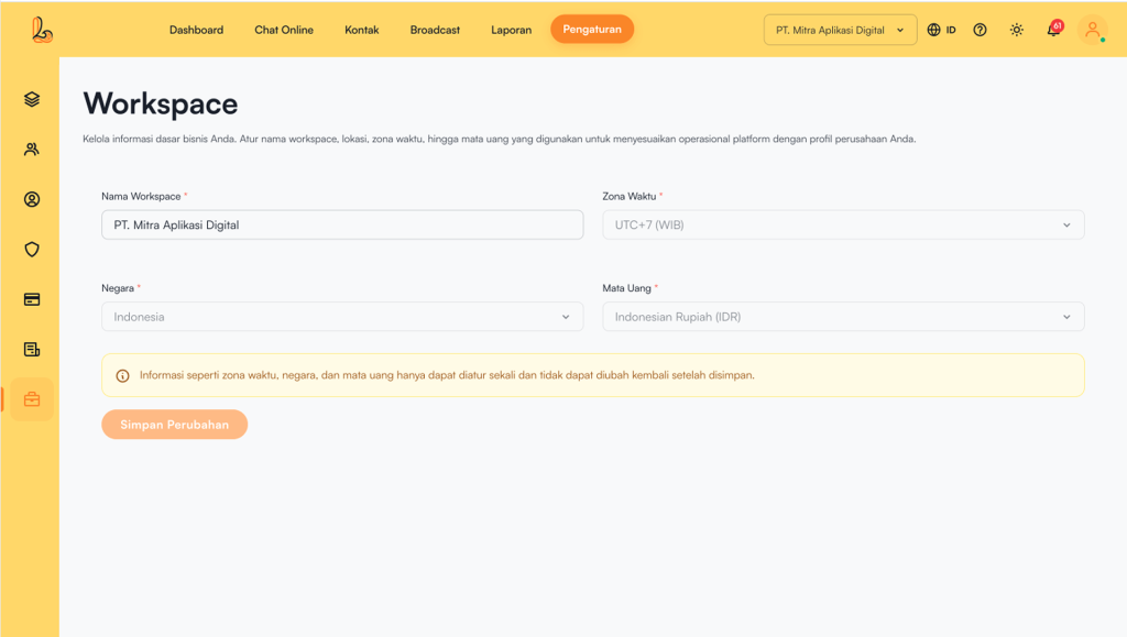 Workspace digunakan untuk mengatur informasi dasar bisnis yang digunakan dalam sistem, seperti nama workspace, lokasi, zona waktu, dan mata uang.